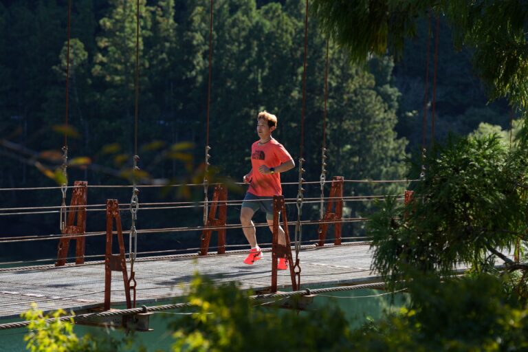 夏、村では冷たい沢の水を引いたプールが無料開放され、山仕事終わりの水泳が最高の日課になりました。ランニングコースの吊り橋から眺める湖水も美しく、村の人から「また走ってんの?」と、温かな声を掛けてもらえるようになったのもうれしかったですね。