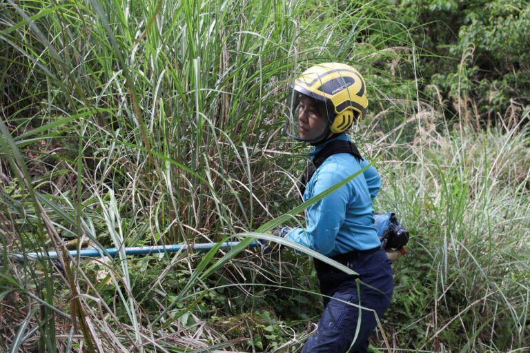 今日の現場は5~6年前に植栽されたスギやヒノキの森で、刈り払い機で下草を刈り取る下刈りを行っています。こういう作業はどれだけ進んだかが一目でわかるので、毎日やりがいを感じます。