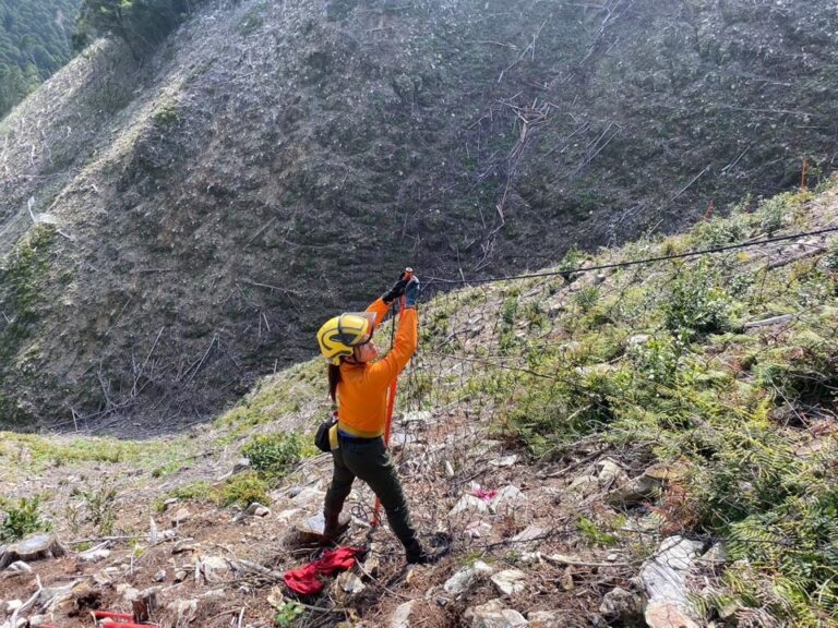 そして、現場に残っている丸太や枝葉を片付けて足場を整える地拵えをします。この後、現場にはポールを立ててネットを張り、樹齢1~2年の苗木を植栽するのですが、こうした資材一式はドローンで運搬しているんです。会社の研修でドローンの国家資格を取得し、今は操縦も行なっています。