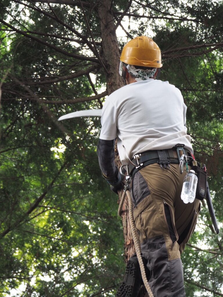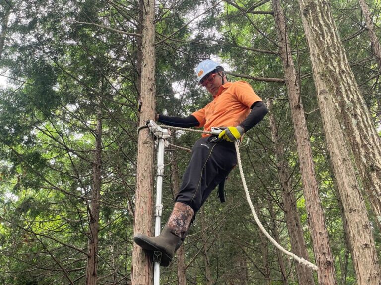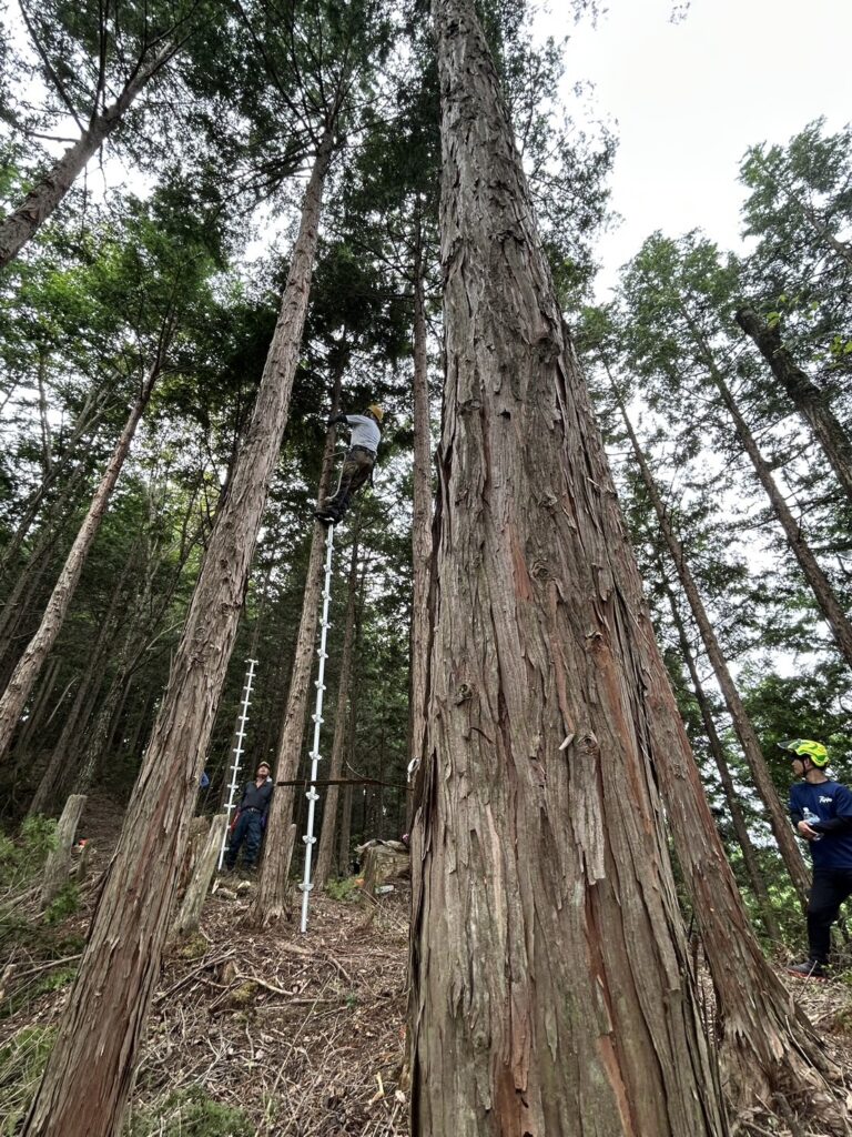 高いところが苦手でしたが、特殊なロープや、かっこいい便利な道具がそろっていて、すいすい上まで登り作業が出来ました。わかやま林業就業サポート講習に参加するだけで、いきなりプロの山の男になったぞ!という気分になれました(笑)