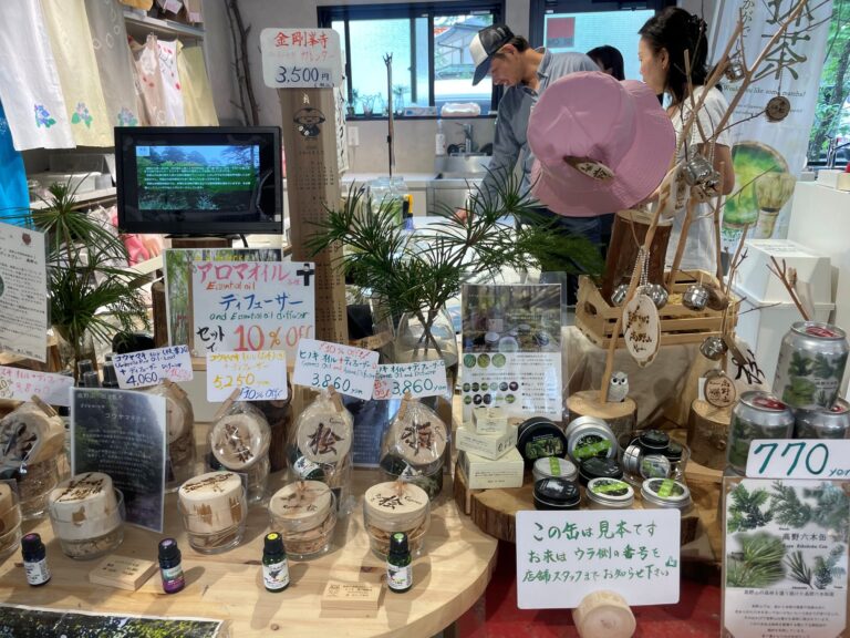 森林の香りがするアロマオイルや、ハンドクリーム、キーホルダーなど素敵な商品がずらり!